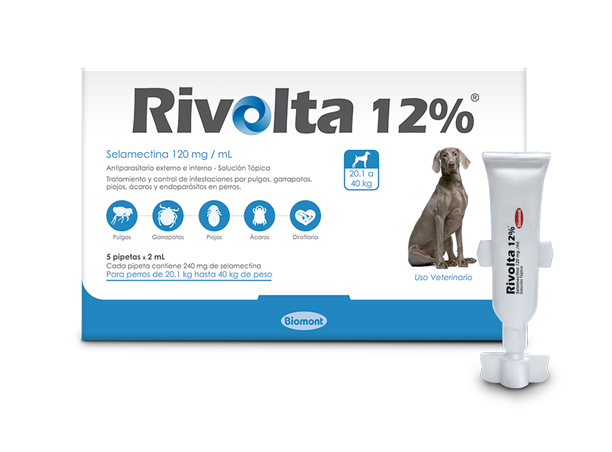 Dosis: Rivolta 12% Azul: Una pipeta de 2 mL para perros de 20 hasta 40 kg de peso. Aplicar cada 4 semanas.