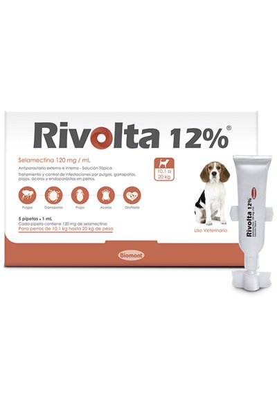 Dosis: Rivolta 12% marrón: Una pipeta de 1 mL para perros de 10 hasta 20 kg de peso. Aplicar cada 4 semanas.