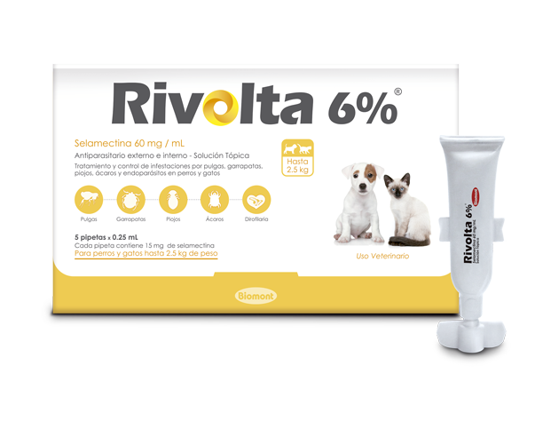 Rivolta 6% Amarillo: Una pipeta de 0.25 mL para gatos hasta 2.5 kg de peso. Aplicar cada 4 semanas.