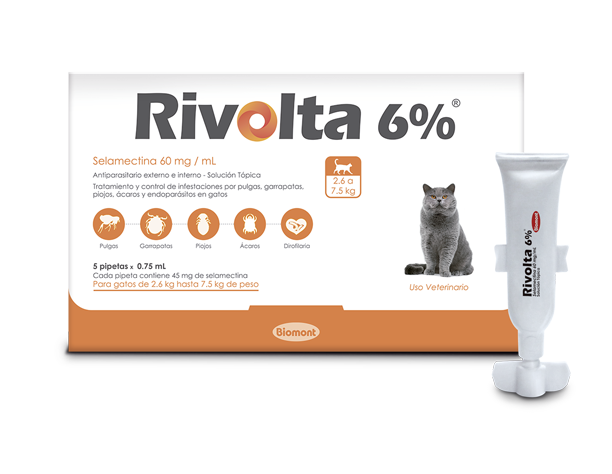 Rivolta 6% Naranja: Una pipeta de 0.75 mL para gatos de 2.6 hasta 7.5 kg de peso. Aplicar cada 4 semanas.