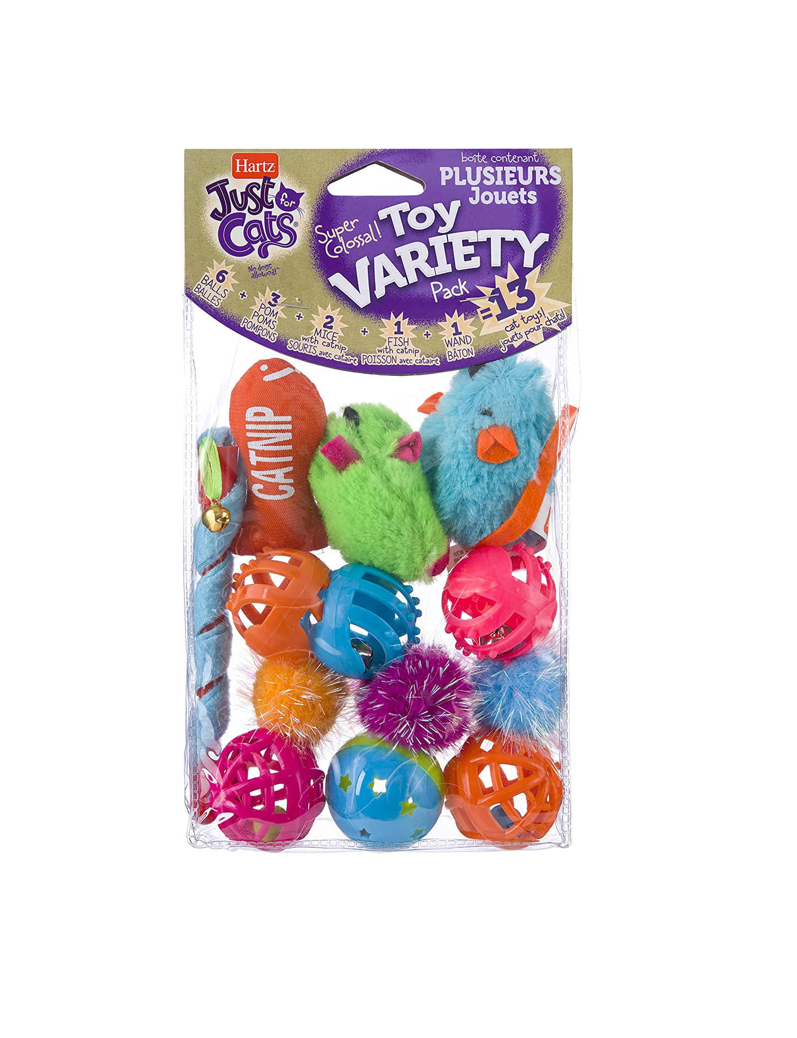 Práctico empaque de juguetes para gato que lo mantendrá cautivado durante horas con un combo de juguetes de Paw. Incluye 6 bolas, 3 pompones, 2 ratones de hierba gatera, 1 pez catnip y 1 varita.